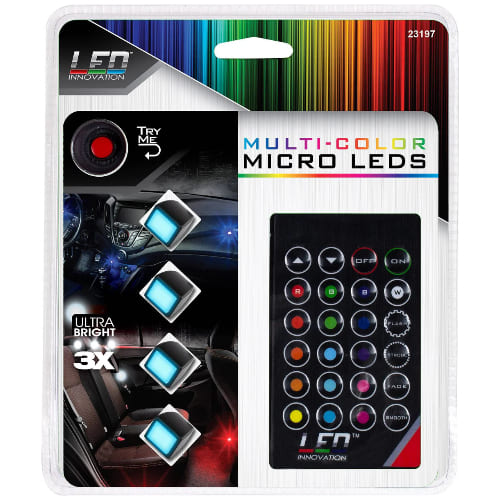 A compact 4‑pod micro‑light kit delivering multicolor LED glow for interior installations, ideal for dash, console, or car‑interior accent lighting.